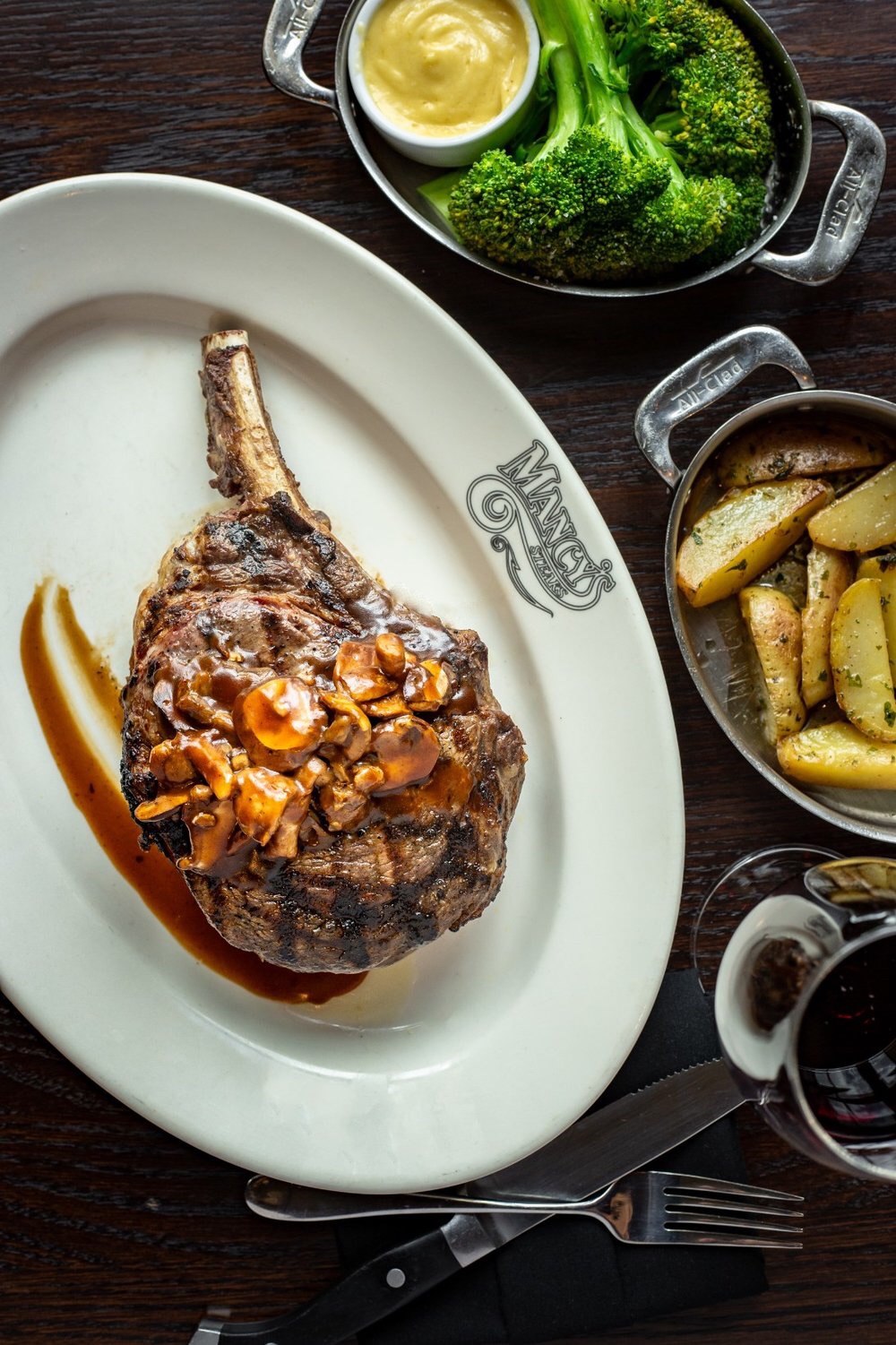 Step into Mancy’s Steakhouse and the world slows down to meet you. Some say it’s the carved wood, brass, and stained glass—reclaimed from a time when craftsmanship was king. But most say it’s the steaks and chops—aged for 28 days using the same time-honored techniques our grandfather taught us. Source: https://mancys.com/steakhouse/