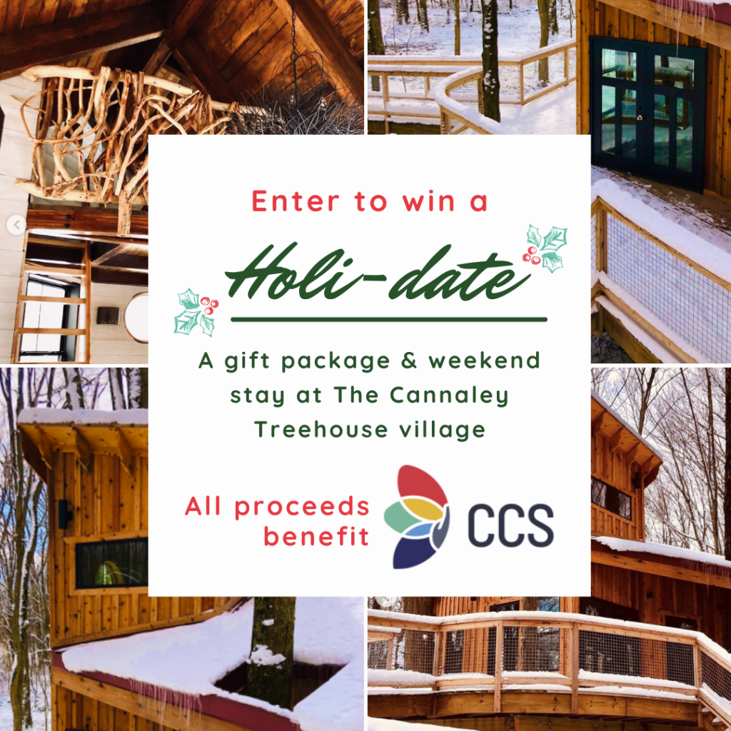 Our friends at Courageous Community Services are hosting a raffle for a 2-night “Holi-date” themed weekend stay at the Cannaley Treehouse Village! This prize includes a warm blanket, two mugs, and hot cocoa mix over the December 11th-12th weekend. One raffle ticket costs $25, and six tickets cost $100.