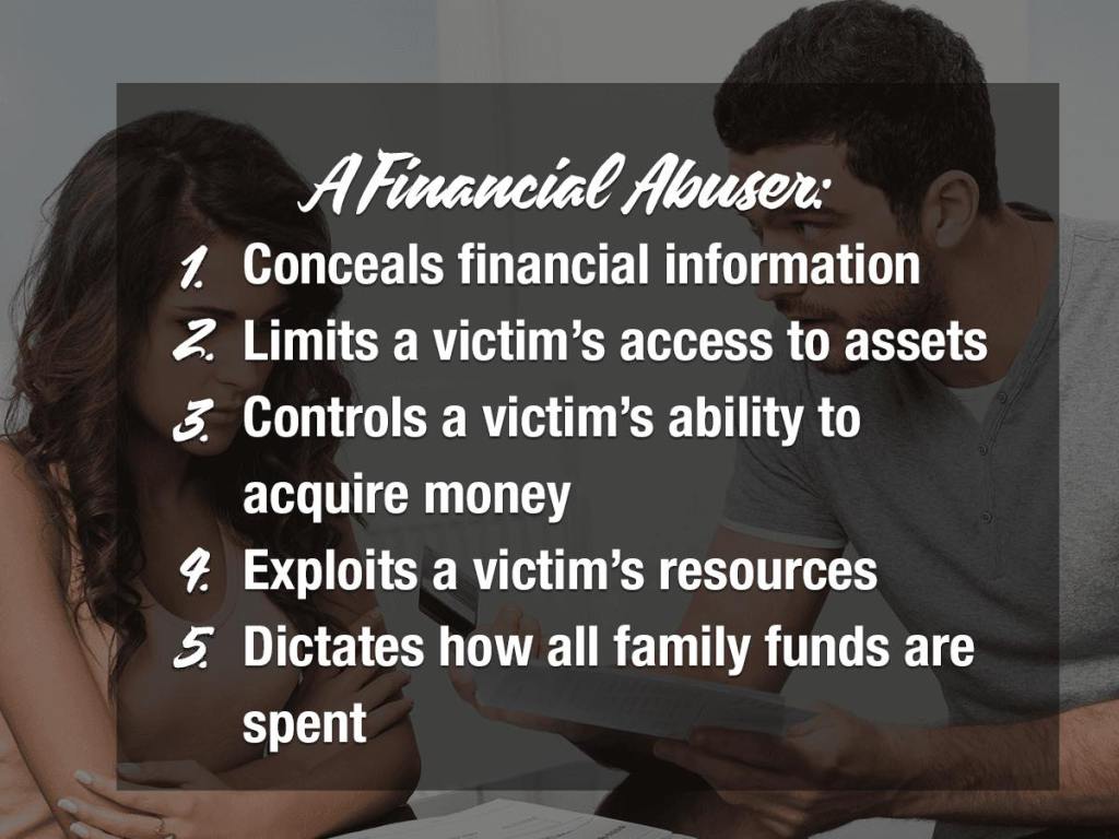 Financial abuse – along with emotional, physical, and sexual abuse – includes behaviors to intentionally manipulate, intimidate, and threaten the victim in order to entrap that person in the relationship. In some cases, financial abuse is present throughout the relationship and in other cases financial abuse becomes present when the survivor is attempting to leave or has left the relationship.