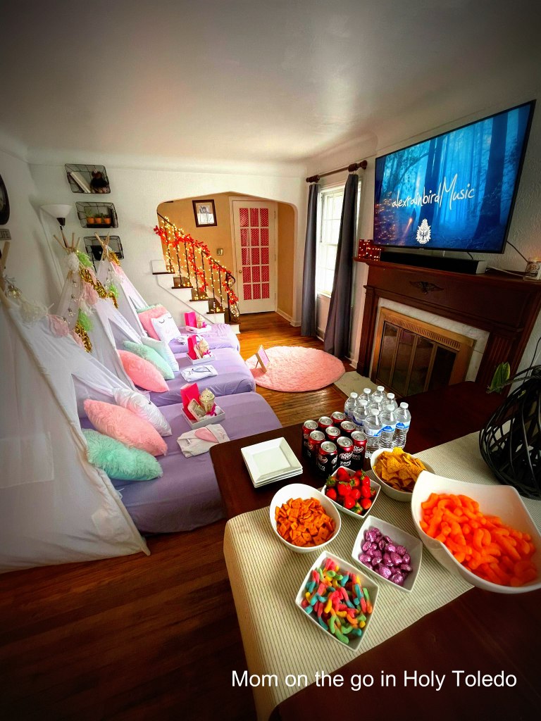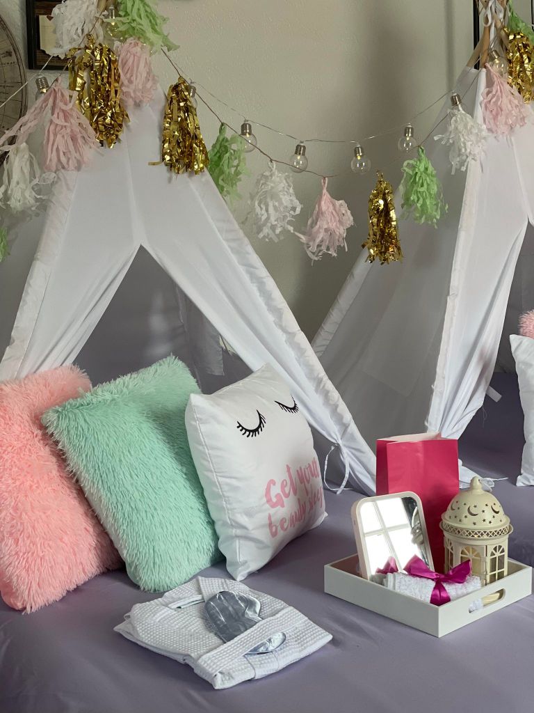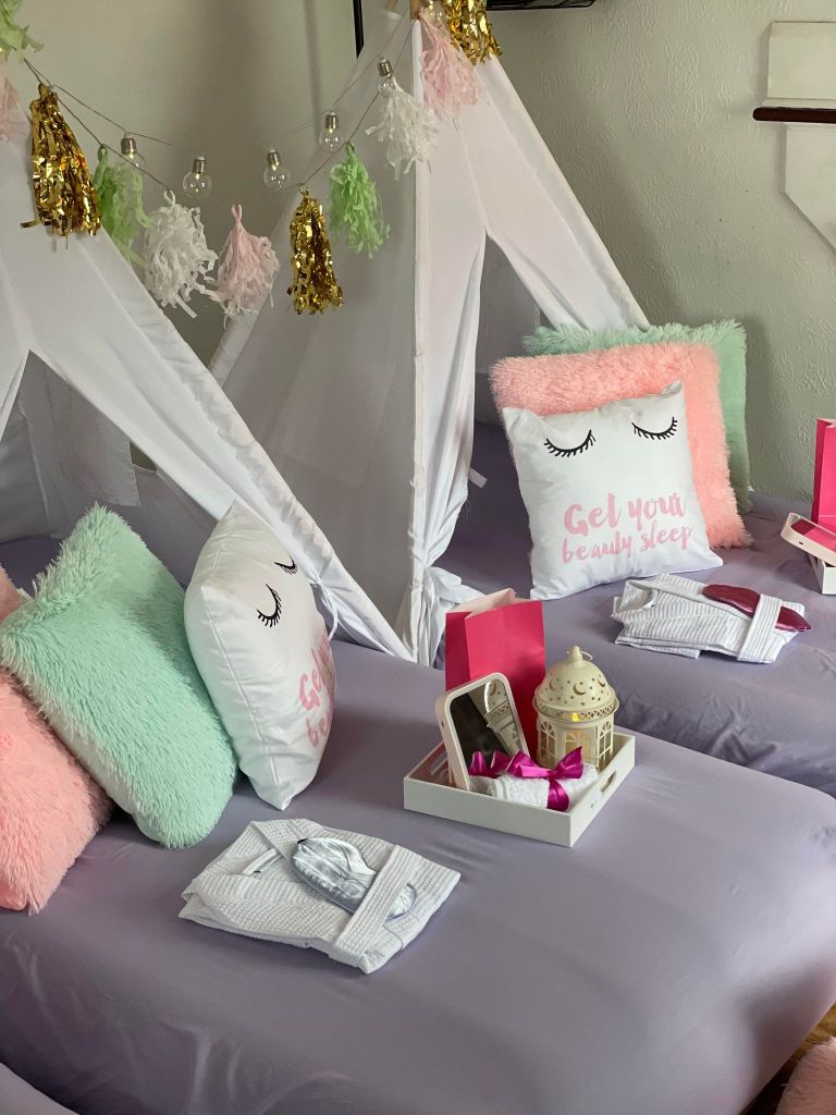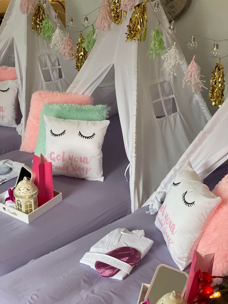 3. Day of the party…Bowlinkles comes and sets everything up, as in EVERYTHING! All you literally need to do is buy food and remind guests to bring their own pillow and sleeping bag. Bowlinkles Bash provides the air mattress, tent, garland, lights, lanterns, tray, throw pillows, rug, goody bag for guests, etc. And the presentation is STELLAR!!