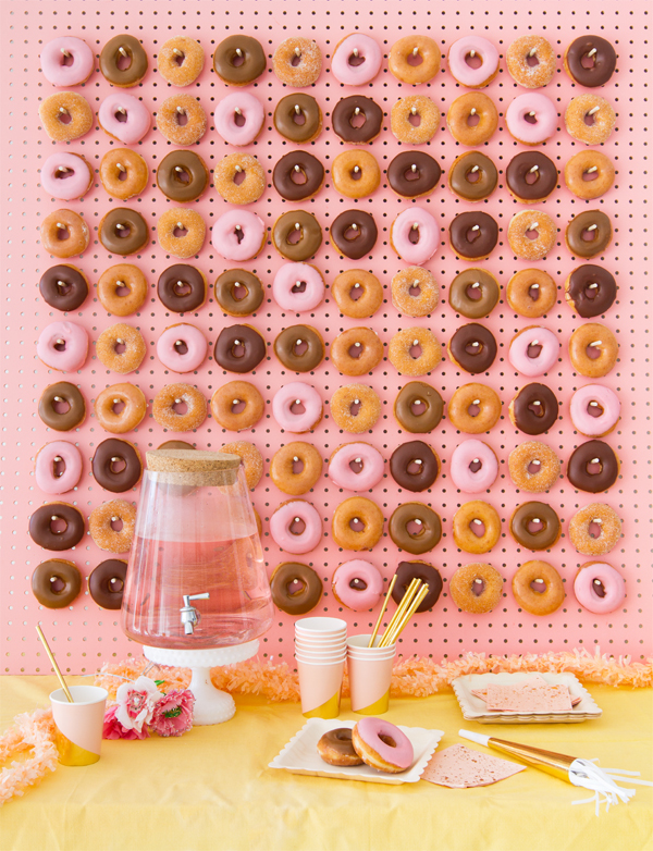 This idea displays tasty treats in a unique fashion that could serve as a backdrop for photos! Order a variety of donuts or make and decorate them yourself. Arrange them on the pegboard for guests to easily remove them, and your dessert table is complete!