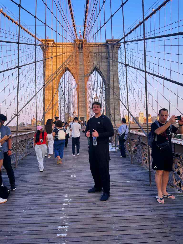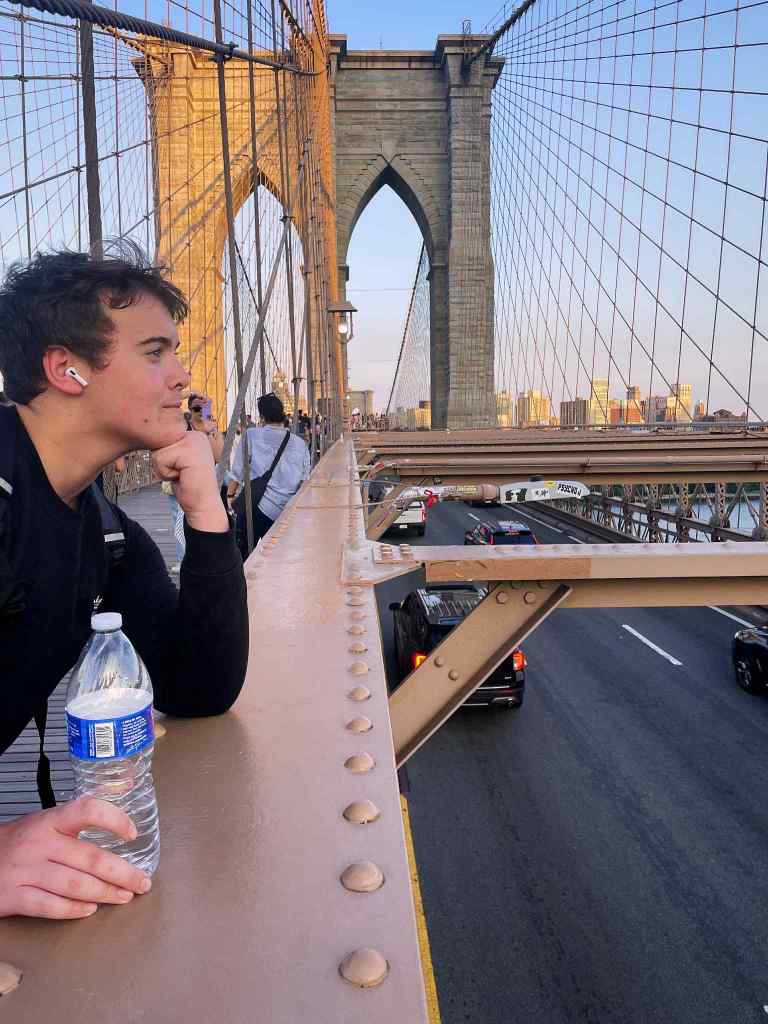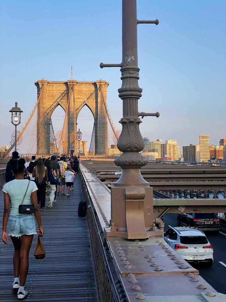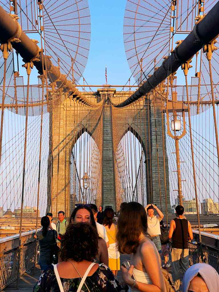 Next up, a short walk from Chinatown, the Brooklyn Bridge! I’ll be entirely transparent, after walking almost 12 miles that day, we slowly had teenagers dropping by the wayside. By the time we finally reached the first Anchorage, it was just my son and me. It was a breathtaking view at sunset. Having the opportunity to walk the bridge has always been on my bucket list, and having it come to fruition meant a lot. Fun fact about the Brooklyn Bridge: it was made possible by, and the first person to cross it was a woman.