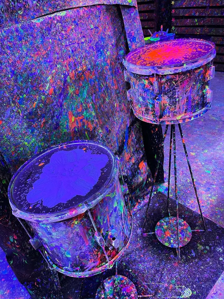Talk about a sweet time! You arrive and are escorted back to the splat room. The excitement and anticipation slowly increase with each step. Upon arrival, you can practically feel the energy in the space, the music, the neon paint splattered on the walls, and the atmosphere screams fun as you’re handed a poncho, booties, and goggles to protect your clothing and eyes from splattered paint. And then the party is officially started when the fluorescent lights go off and the black lights go on, the music goes up, paint is applied, and splatting one another is encouraged. When else in their lives can kids just have a bit of paint-splattering fun!