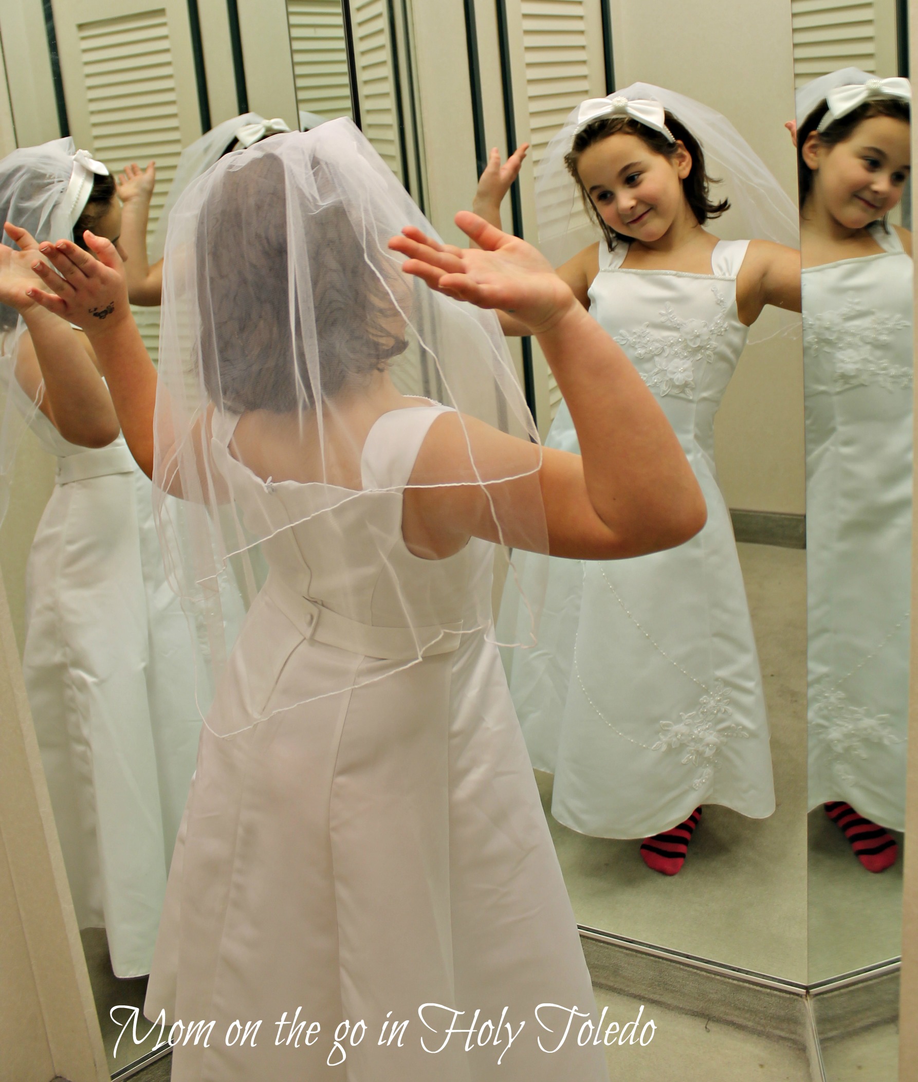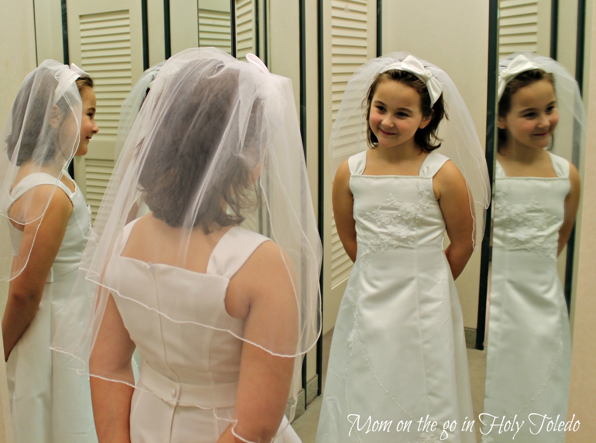 Her eyes lit up when she walked into the fitting room and put on the first dress. Meanwhile my eyes started to tear up a little. It felt like just yesterday I was carefully removing her baptismal gown and now here I was helping her try on First Communion dresses. Where does the time go?