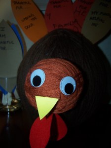 The first week of November or, two weeks prior to Thanksgiving have your children begin writing down something they are grateful for each day. Then have them stick the feather in the Turkey. On Thanksgiving Day your family will have a lovely center piece of thanks.