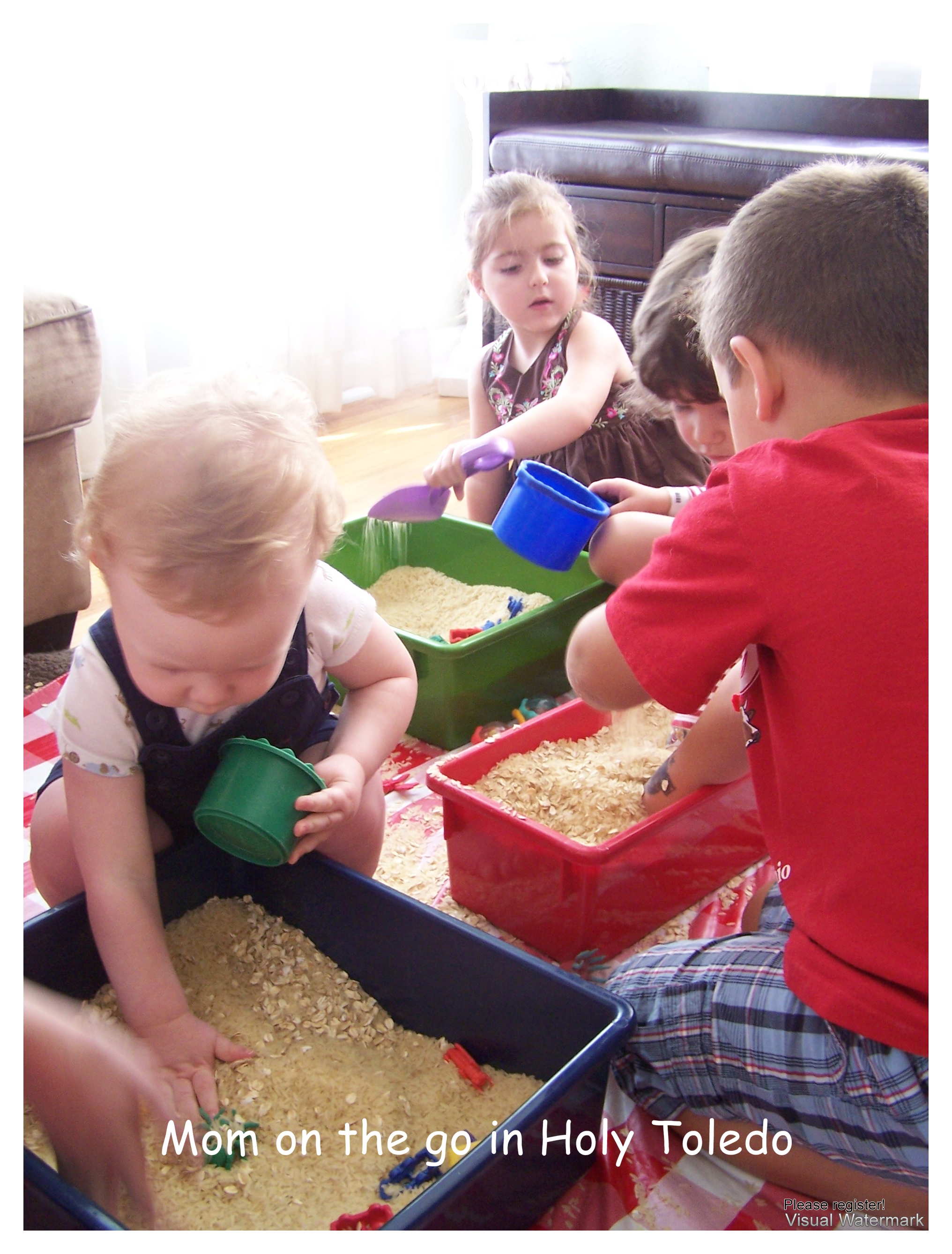 7. Tactile Tubs- put down a tarp or shower curtain, grab some tubs, fill tubs with dry rice and/or oats, and hide treasures for kiddos to find.
