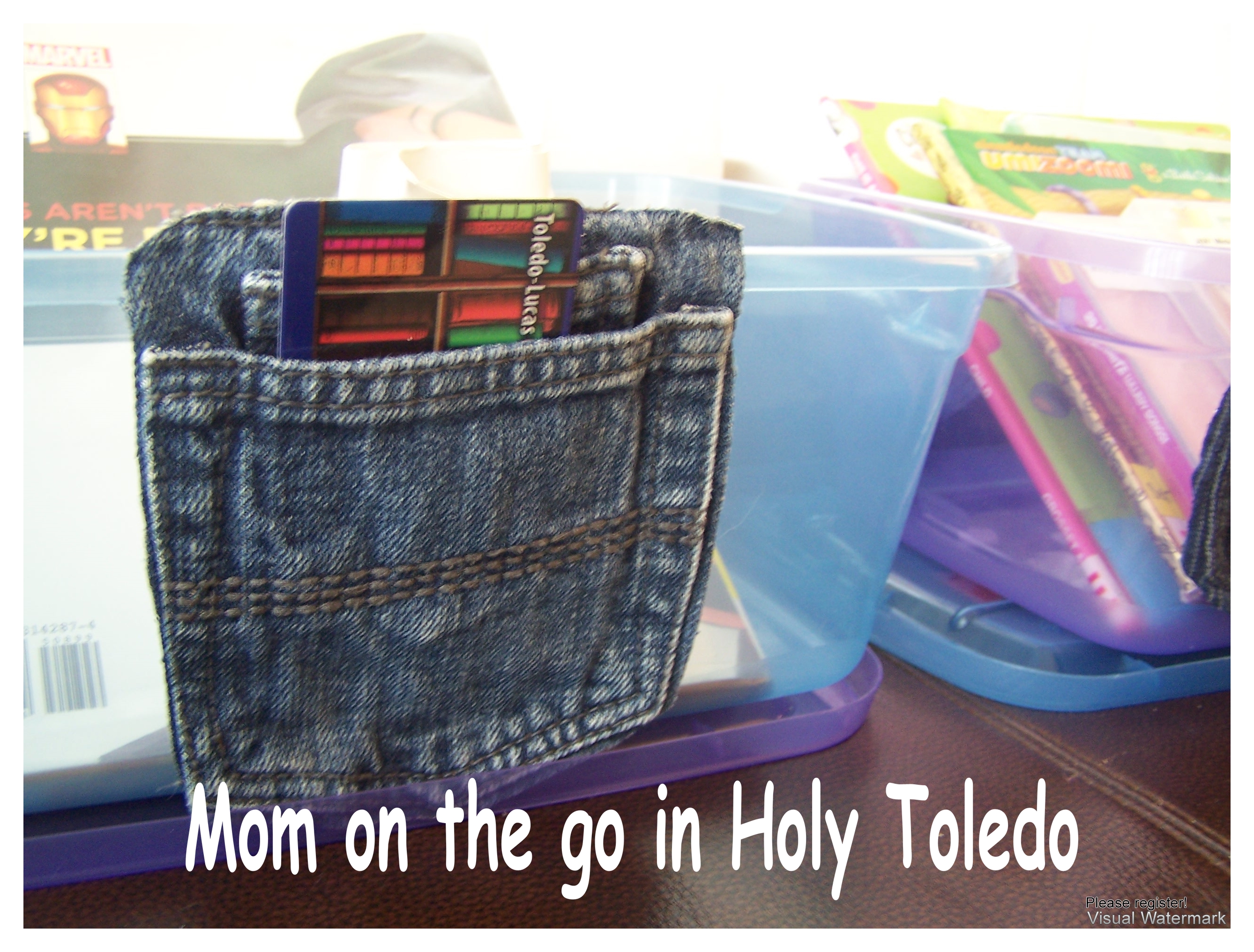 As soon as the kiddos arrive home with their books, CDs, etc. from the library they go directly into their own tub. In addition to the items they checked out their library card (all 3 of our kiddos have their own library card, yes, even our 2-1/2 yr. old…this is a superb way to start teaching responsibility from a young age….when given the proper guidance) and receipt with the names of the items checked out and when they are due back goes into the pocket.