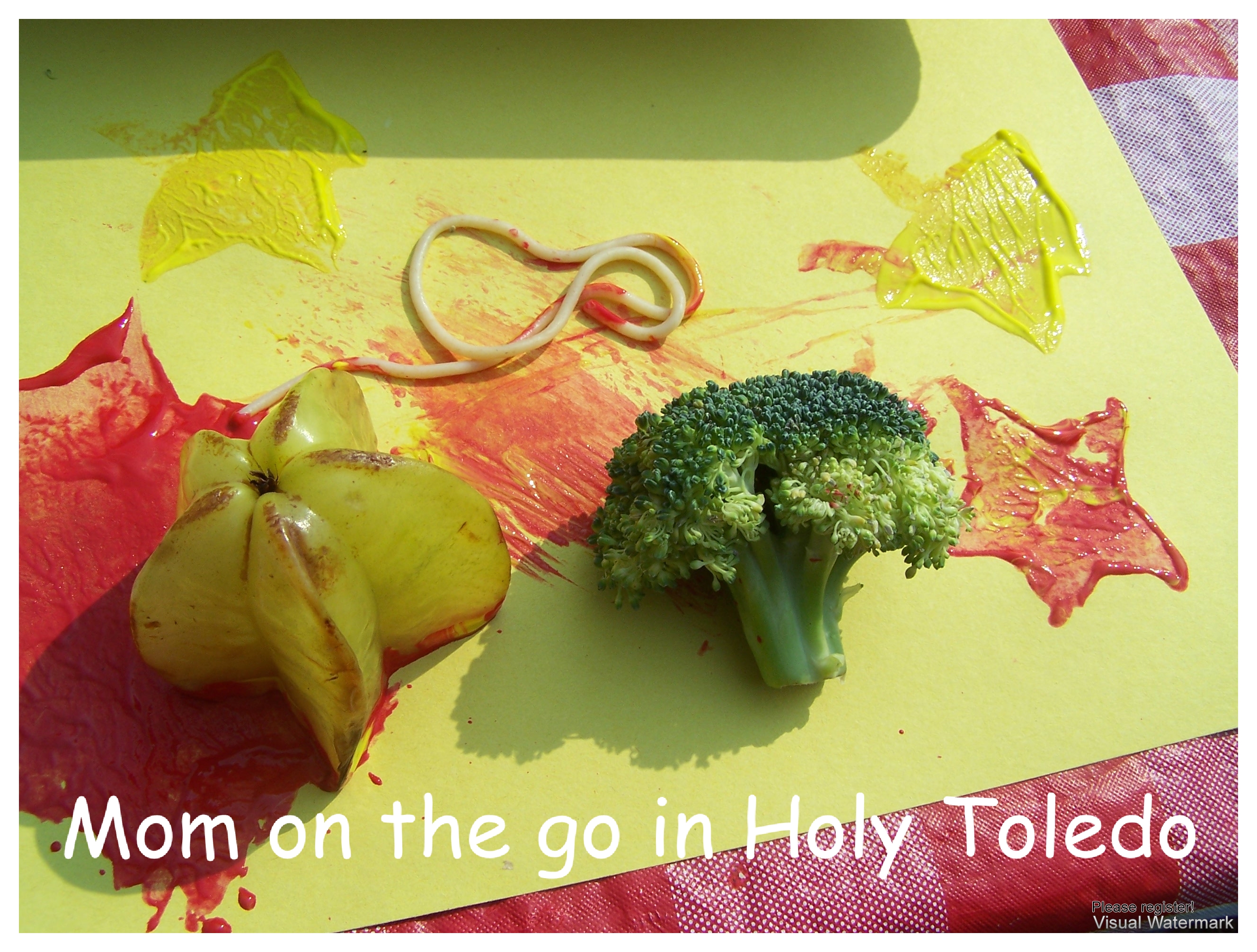 14. Play with your food-cut veggies, grab dry and cooked noodles, place paint on plates and allow kiddos to stamp veggies and let their imaginations wander!