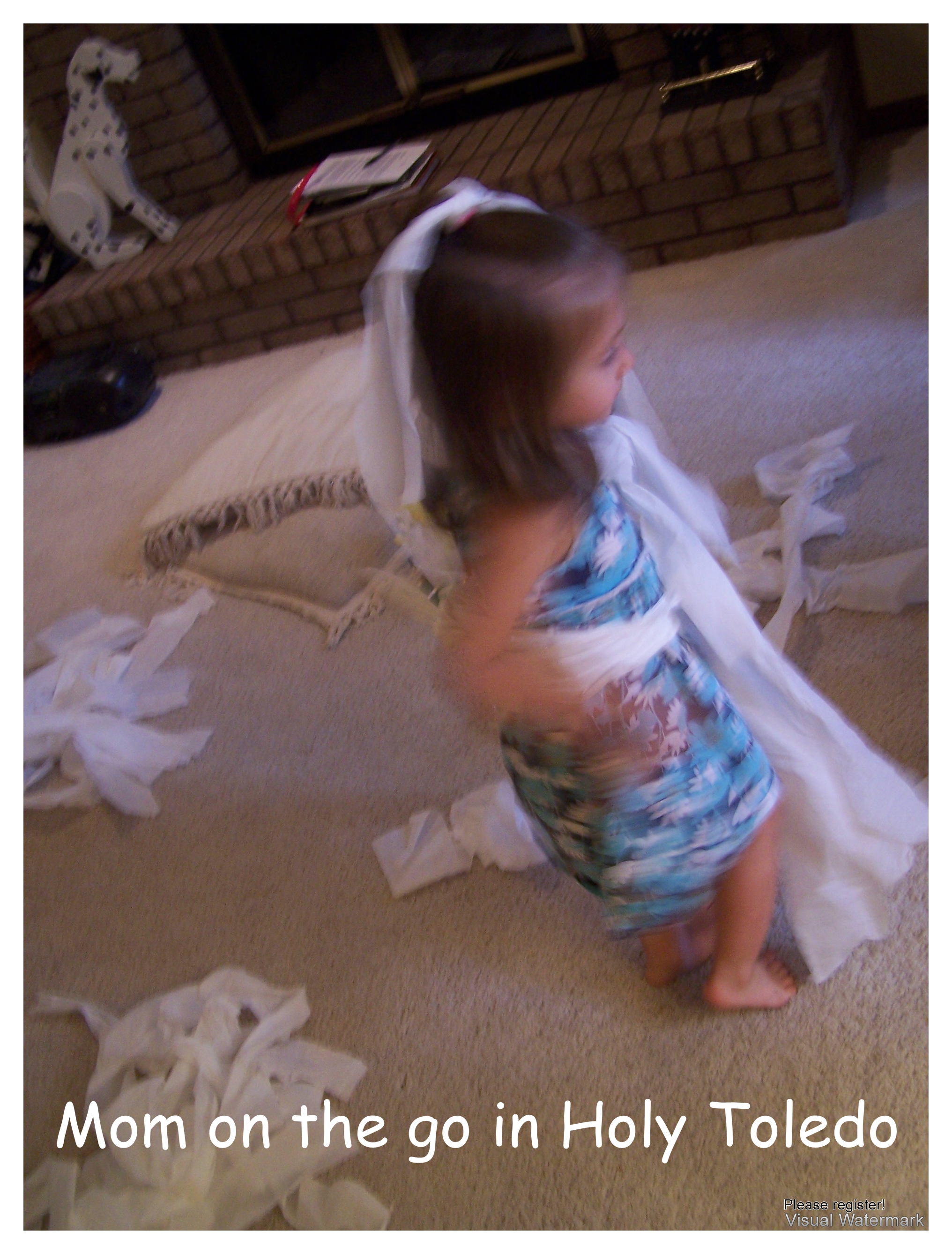 So your little one plays with the toys for roughly ten minutes and then where does their attention move? That’s right that darn packaging! Whether it is the cardboard box, plastic do-hicks (what are they called?), bubble wrap, etc. No matter how hard Fisher-Price, Mattel, Melissa & Doug, etc. try they can’t trump a child’s imagination. One such example, toilet paper wedding dresses….