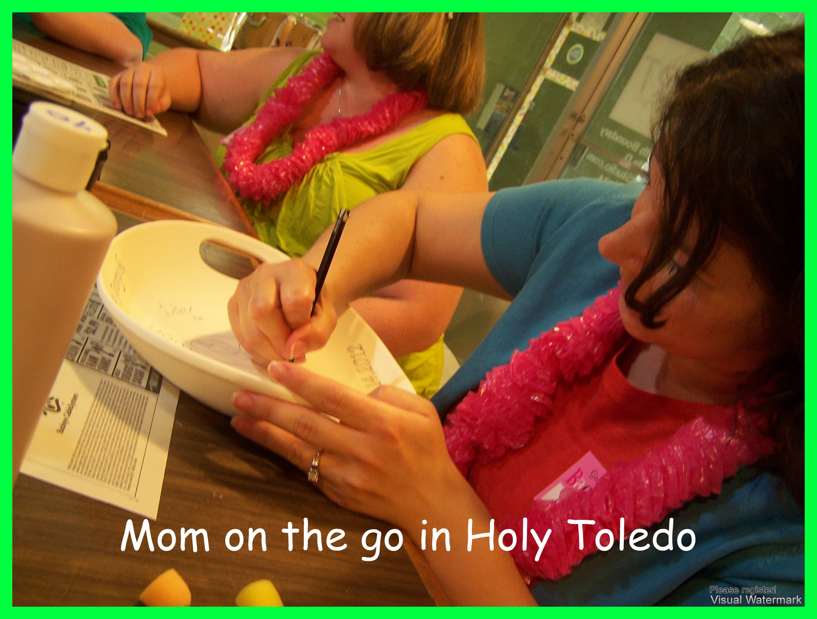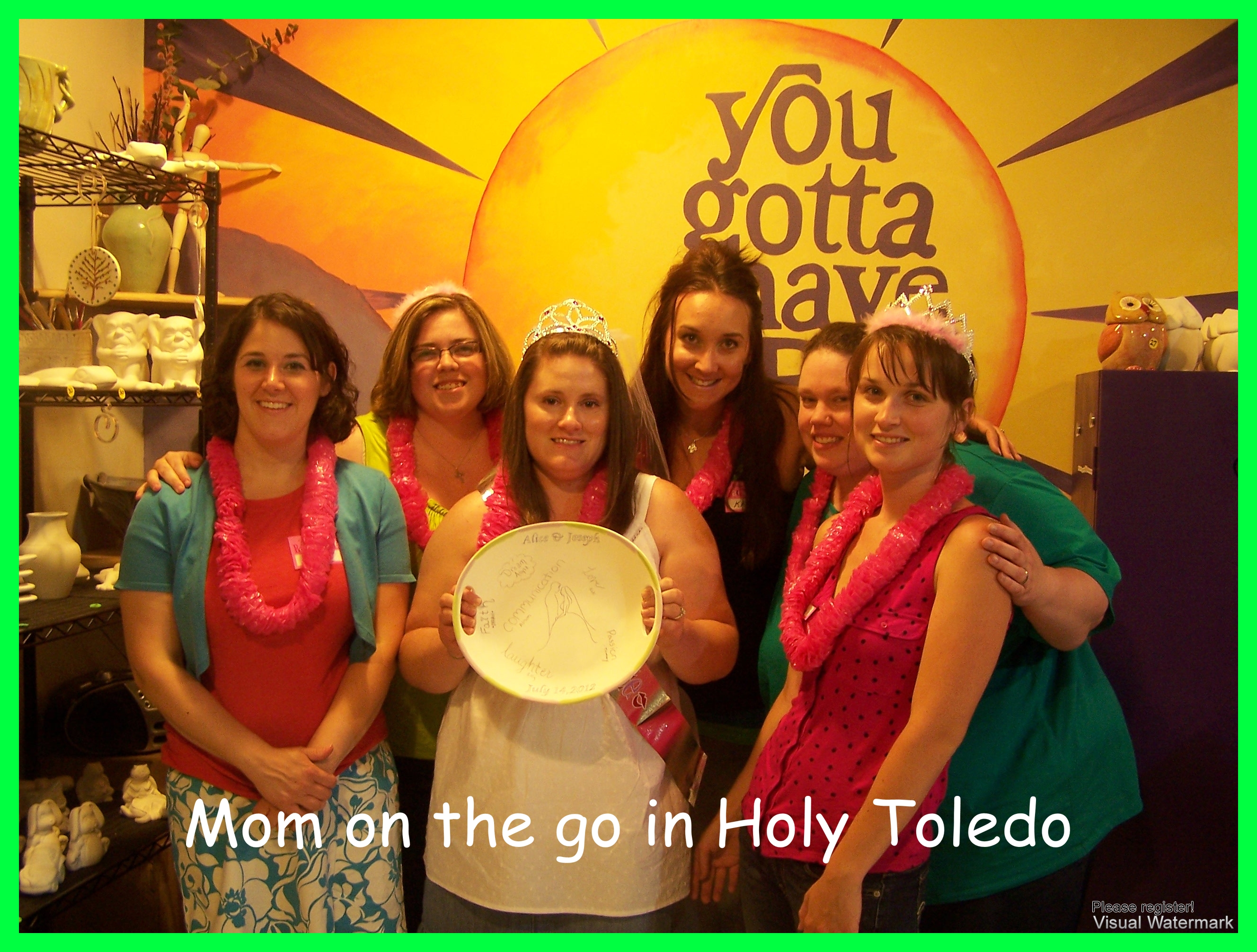 We ended up having 6 wonderful moms at the Bachelorette party and it was a blast! We all decide on a serving platter to make for the bride and groom. Per the owner’s suggestion we had the bride and grooms names, the date of their wedding, a bride and groom image in the center, and each of us contributed a word to the platter that is relevant in marriage (dream, faith, love, laughter, trust, etc).
