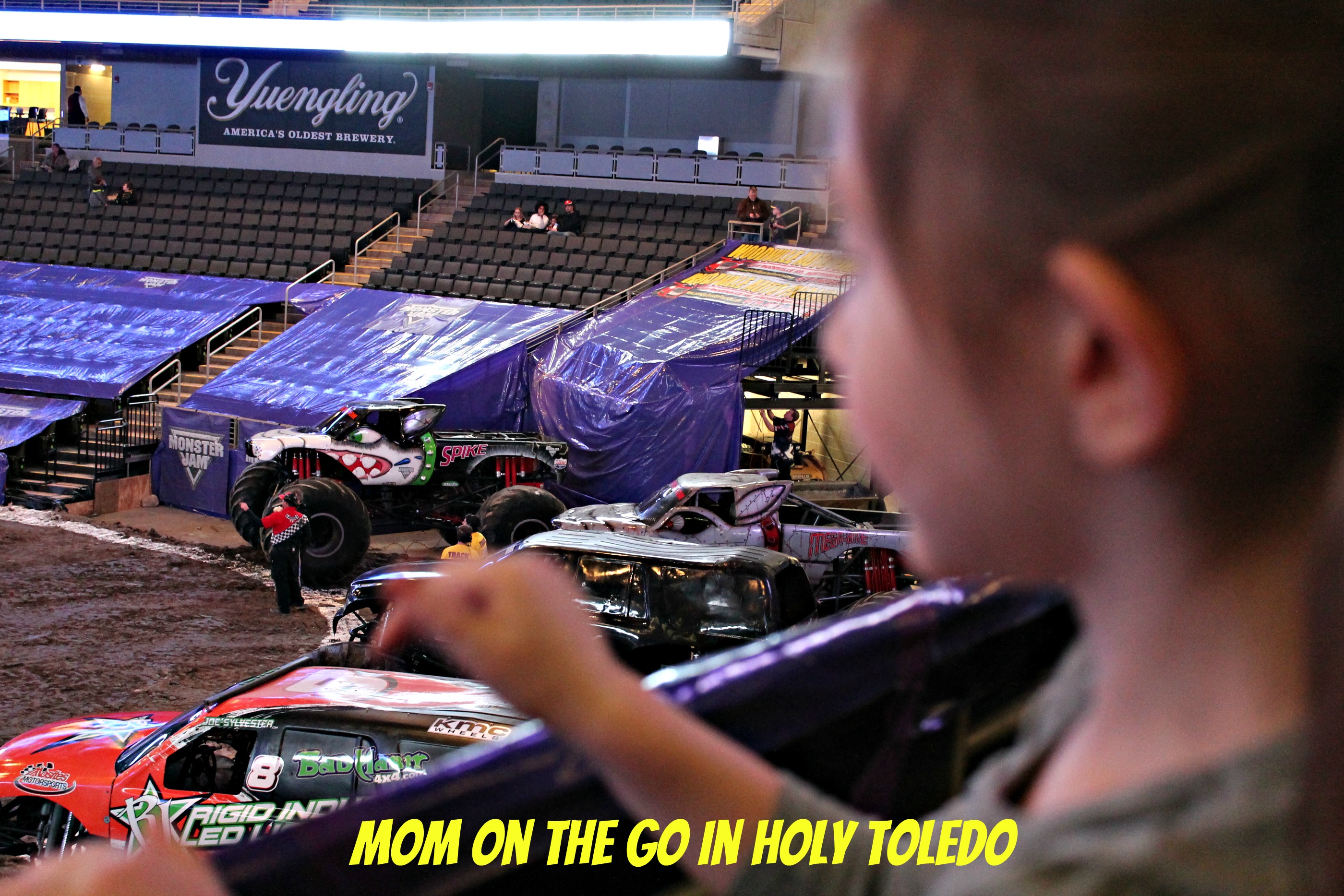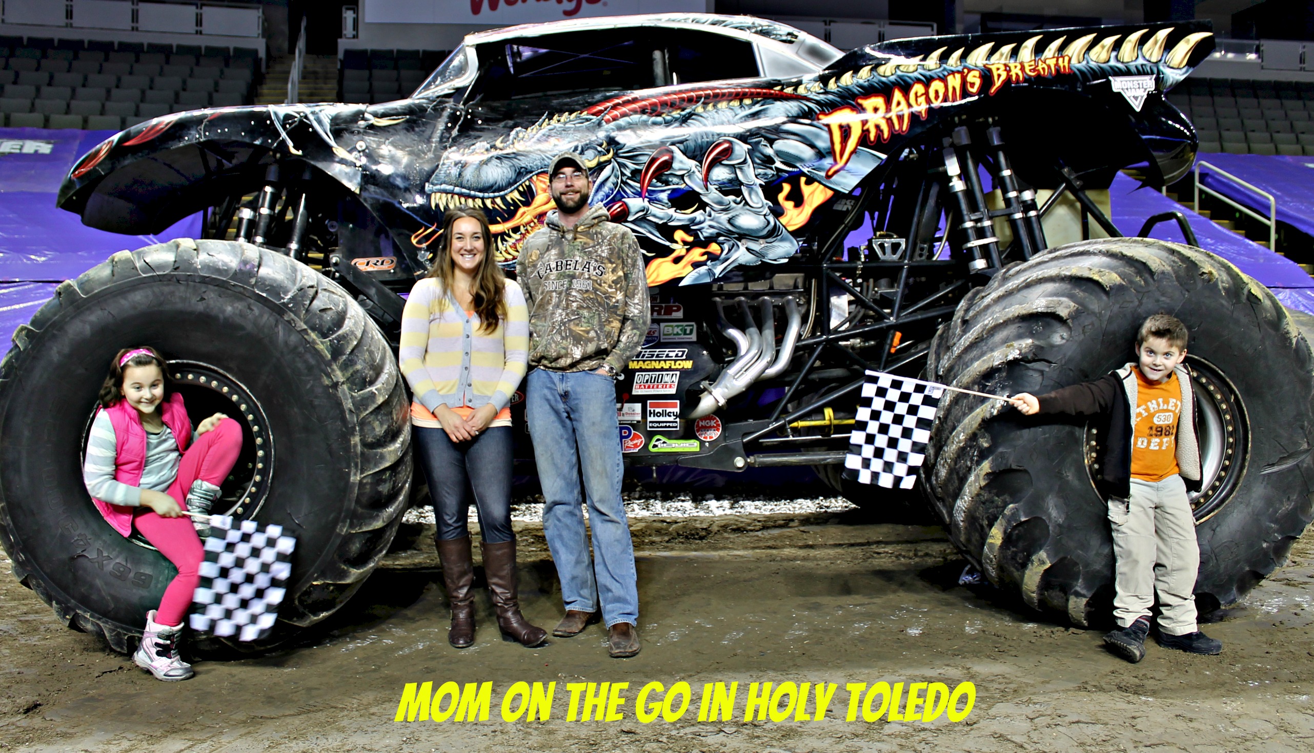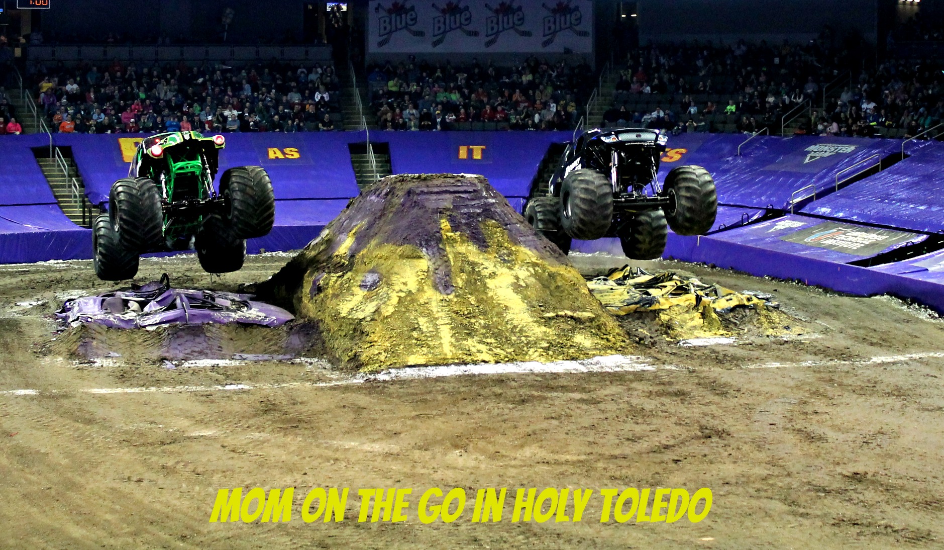 We went to Monster Jam last night! The kiddos had a blast! Well, 2 out of 3 of the kiddos had a blast. Our 5 year old had issues with the noise, so her and daddy watched via the television in the lobby while enjoying refreshments. They had their own little daddy & daughter date. The older two, our 8 and 10 year olds lost their minds in all the noise; they were cheering, jumping up and down, and simply beaming with joy!