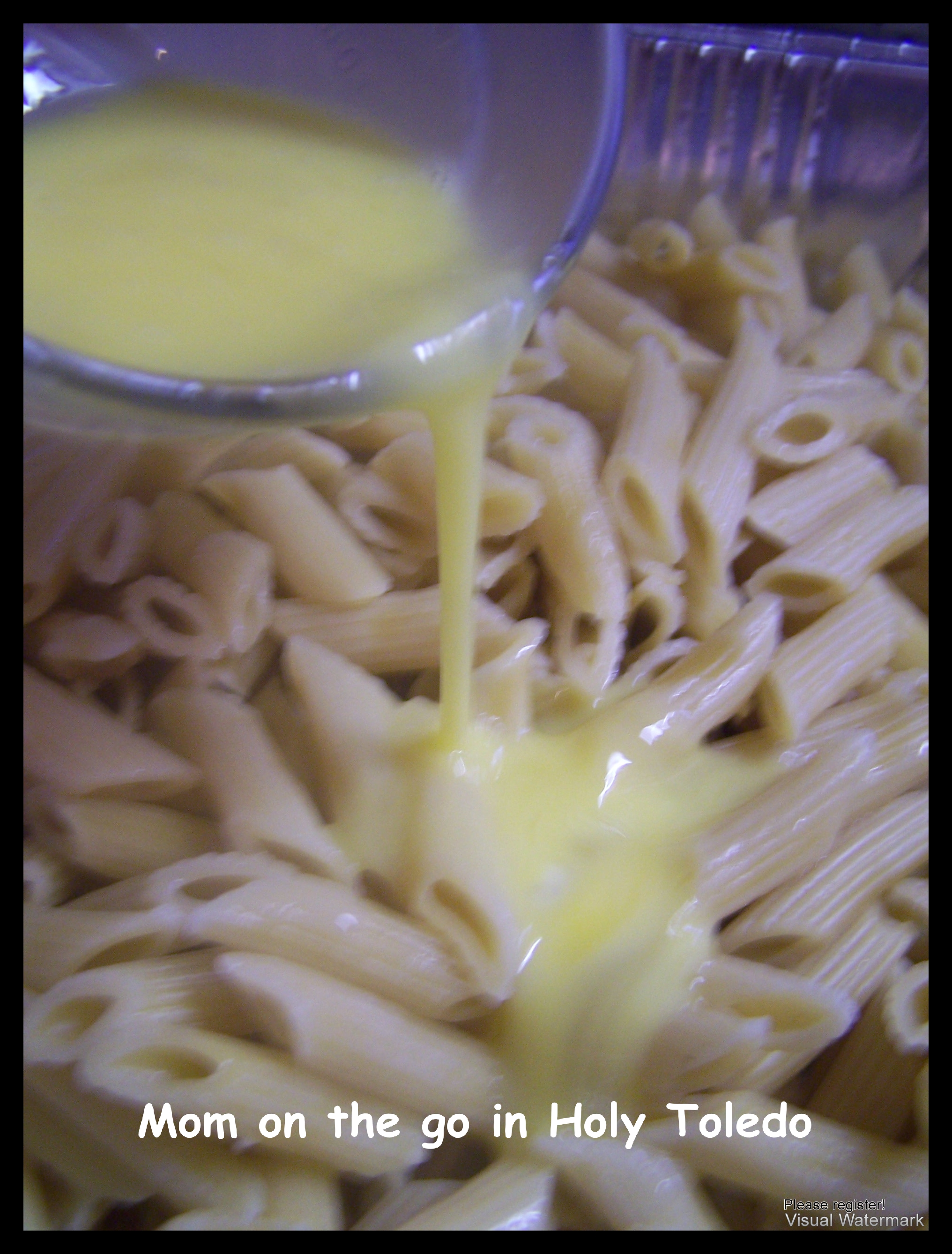 Pour mixture over pasta and mix so that sauce covers all the pasta. Sprinkle remaining Mozzarella over the top. Cover with aluminum foil. Label, date, and add directions with a permanent marker (this makes it effortless for your hubby, sitter, etc. to pull it out of the freezer and prepare).
