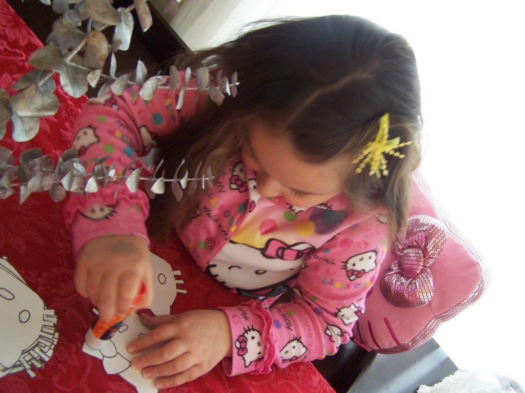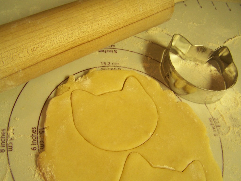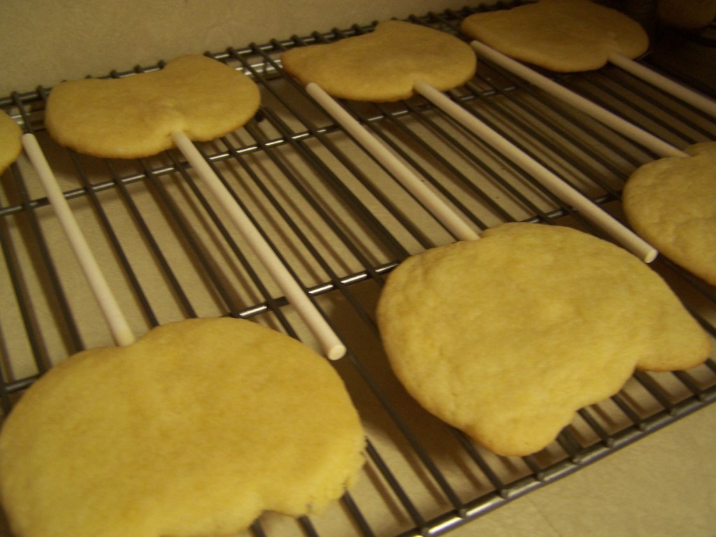 I recovered from the whole cake pop incident and moved onto cookies. Instead of Hello Kitty cake pops my daughter was quite pleased with the idea of a cookie on a stick (honestly, I think if you put anything on a stick a kid would eat it, I think I might try Brussels sprouts on a stick ). So we made Hello Kitty cookies on a stick and attached cute Hello Kitty valentines to each.