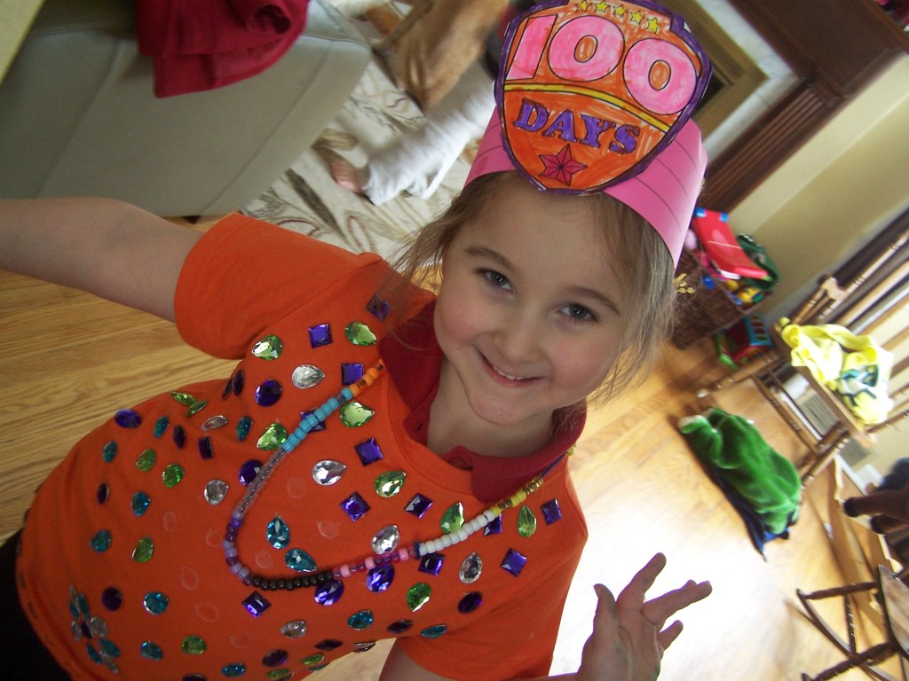 When I picked her up from school today she had a 100th day crown (again, something kids love so much) on her head and a huge smile on her face. She informed me that 7 of her jewels fell of but she still liked having the shirt (so much for the glue gun, looks like I will have to bite the bullet and learn how to sew. No more duct tape and glue guns).